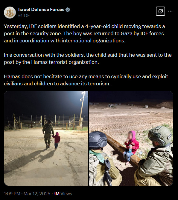 Yesterday the two images in the X post below went viral on social media. The IDF safely returned a 4-year-old child who claimed to have been sent to the military post by Hamas. Times of Israel questions the veracity of this report and wonders how a 4-yo kid could know that Hamas sent him. That’s easy, TOI; they told him to say that.
